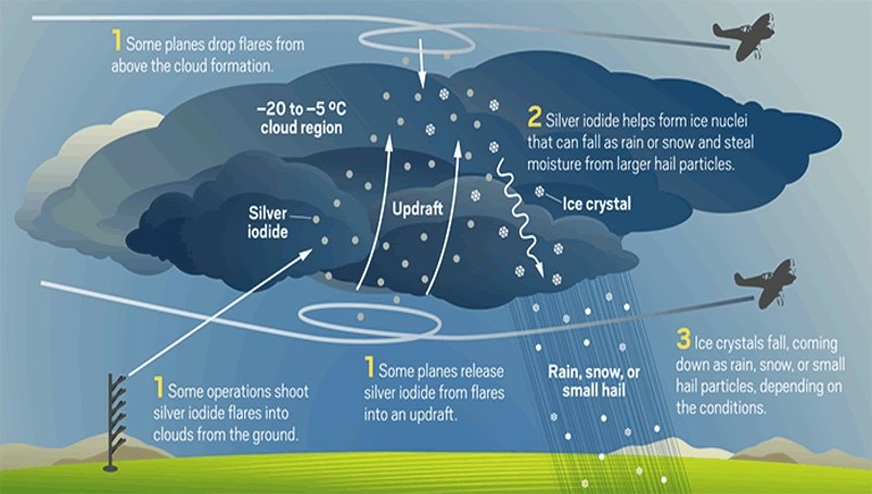 - “Seeding or dispersing substances into clouds to alter drop size distribution”